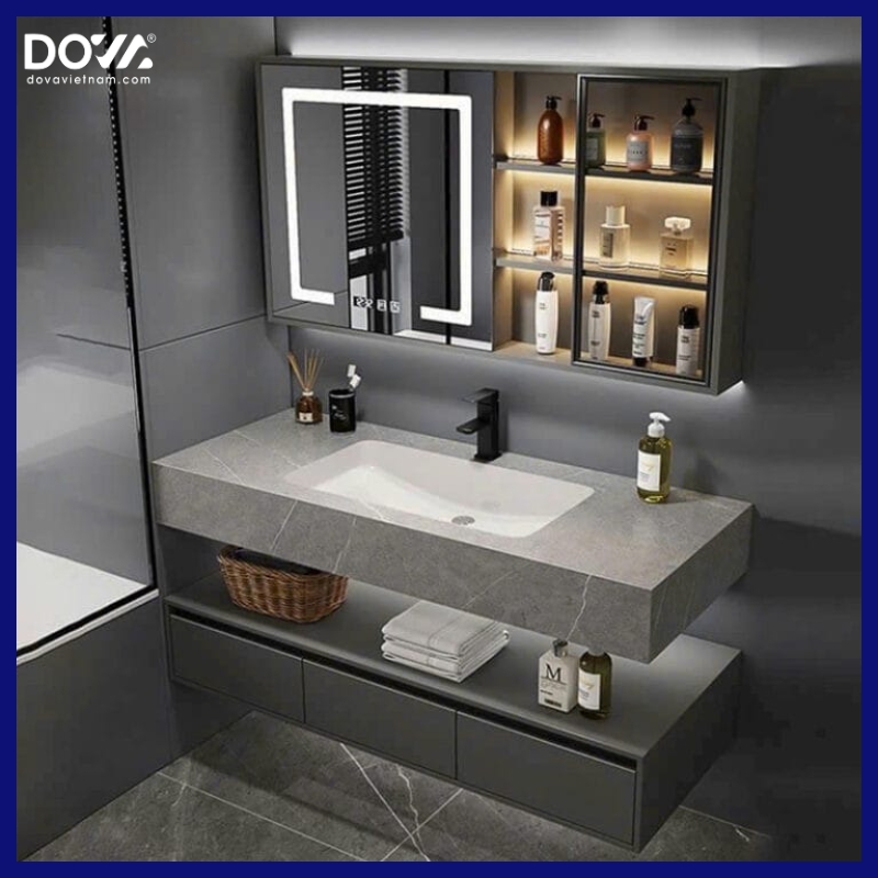 - Kiểu dáng: Tầng trên: chậu âm bàn đá tràn viền, Tầng dưới là tủ chậu nhựa.